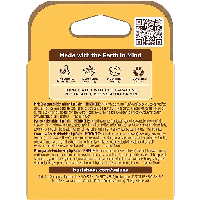 - FLAVORFUL LIP BALM: One package contains four 0.15 oz. lip balm tubes of Burt’s Bees Lip Balm in Pink Grapefruit, Mango, Coconut and Pear, and Pomegranate flavors to moisturize and soften your lips