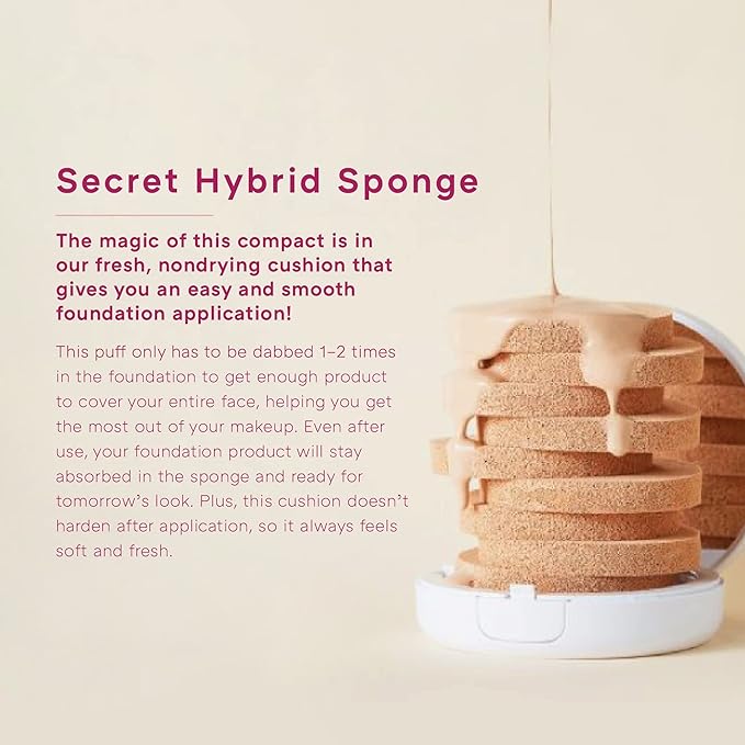 - Innovative Secret Hybrid Sponge: Enjoy easy and smooth foundation application with our fresh, non-drying cushion puff. Just dab 1-2 times for full-face coverage, and the sponge retains product for tomorrow's use without hardening.