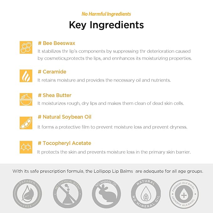 - Moisturize your lips with Beeswax: The Lollipop Korean Lip Balms are formulated with Beeswax, known for its excellent hydrating properties that lock moisture in your lips; as it’s mixed with Soybean Oil, its moisturizing impact is even more effective. The benefits of Beeswax extend to UV ray protection. A truly moisturizing and protective Korean lip balm.