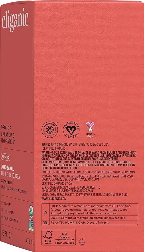 - 100% Pure, Single Ingredient Oil - Cliganic organic jojoba oil is a single-ingredient product. No synthetic additives, ever.