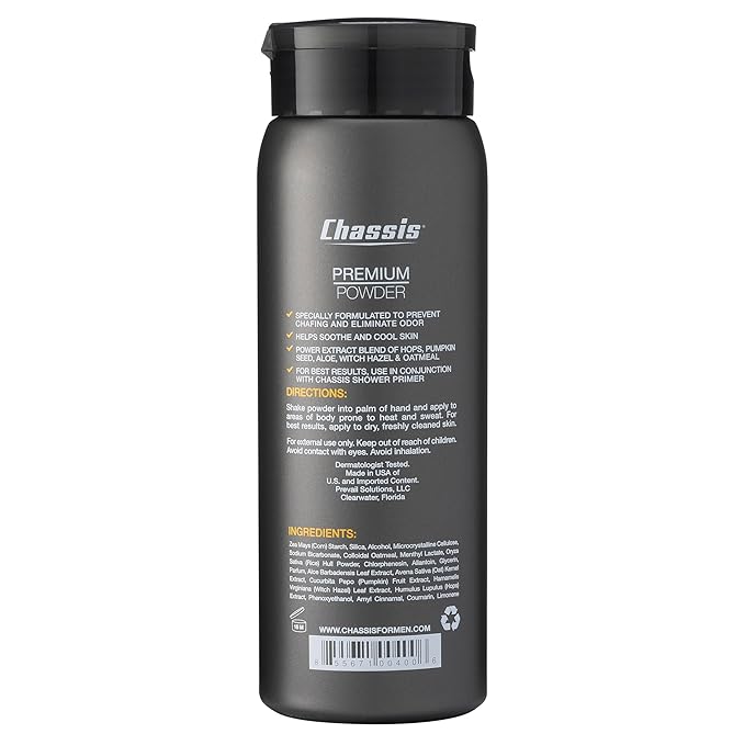 - BODY POWDER FOR MEN: Keep your motor running with Chassis Premium Powder, the ultimate odor protection, chafing prevention, and sweat reduction—all in one convenient product. Chassis powder features the exclusive Hydro-Shield Technology and Power Extract Blend. Chassis specializes in natural care for your undercarriage with products that last all day.