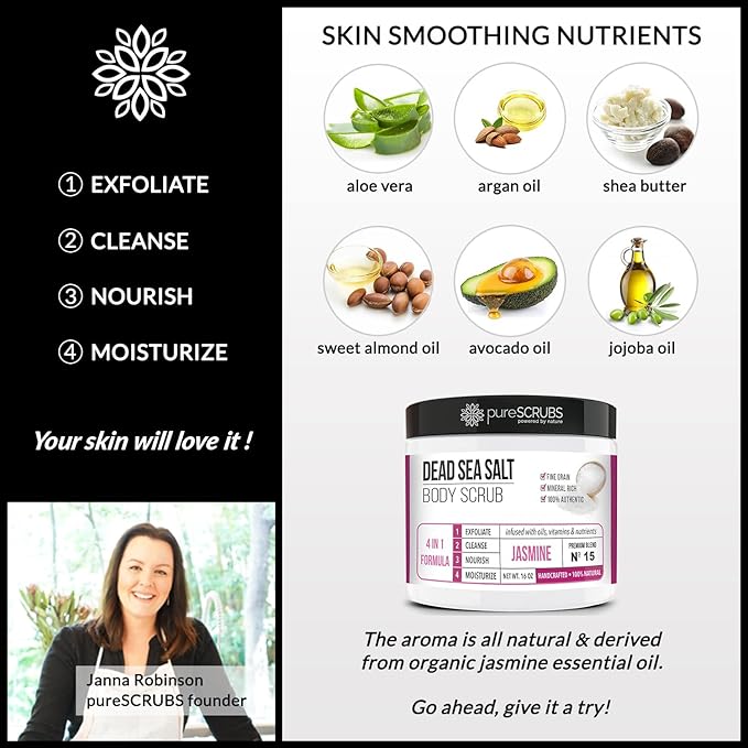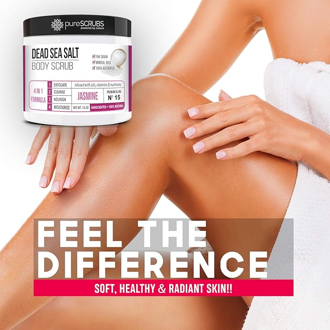- GET ULTRA SMOOTH SKIN FAST - THIS WORKS! Our unique “4 in 1 Formula” does everything a body scrub should do and more - EXFOLIATE, CLEANSE, NOURISH & MOISTURIZE. Fine grain dead sea salt infused with essential oils, nutrients and skin softeners helps to smooth away rough, bumpy, and uneven textures to instantly reveal your true soft, healthy and radiant skin. You'll love the jasmine aroma!