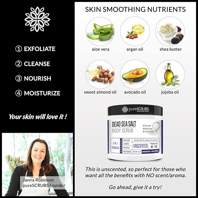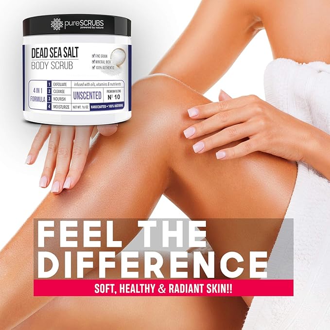 - GET ULTRA SMOOTH SKIN FAST - THIS WORKS! Our unique “4 in 1 Formula” does everything a body scrub should do and more - EXFOLIATE, CLEANSE, NOURISH & MOISTURIZE. Fine grain dead sea salt infused with essential oils, nutrients and skin softeners helps to smooth away rough, bumpy, and uneven textures to instantly reveal your true soft, healthy and radiant skin.