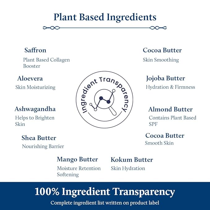 - Indian Ayurveda Herbs like Saffron, Turmeric, and Withania Somnifera combine with blend of natural body butters to bolster natural elasticity of skin for a firming effect, to aid in appearance of stretch mark and scars over a period of time