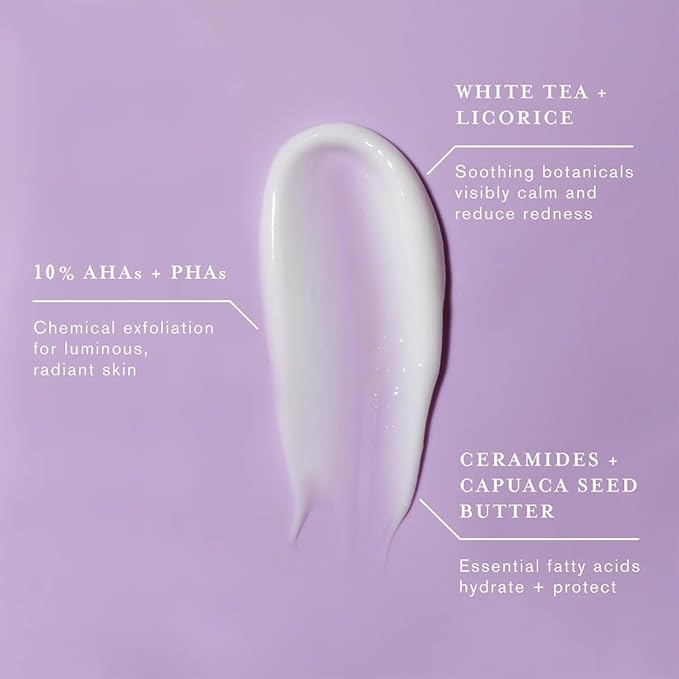 - FEATURED INGREDIENTS: Glycolic + Lactic Acids – Potent AHAs that exfoliate for smoother, softer skin. Ceramides – Prevent moisture loss and support a healthy skin barrier. Urea – Draws moisture from the air to hydrate skin. Gluconolactone – PHA that exfoliates, hydrates, and offers anti-aging benefits. Lactobionic Acid – A gentle PHA for hydration and exfoliation. Squalane – Restores and hydrates. Cupuacu Seed Butter – Moisturizes and protects with polyphenols. Anti-Redness Complex – Reduces redness and calms skin. Willow Bark – Exfoliates deeply as a natural BHA.