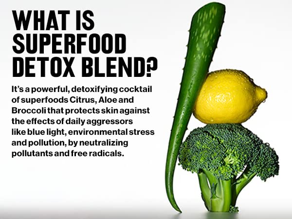 - SUPERFOOD DETOX BLEND : Infused with powerful antioxidants Citrus, Aloe & Broccoli to help neutralize harmful free radicals and shield skin
