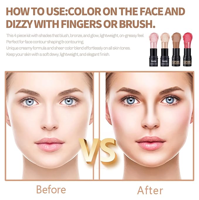 4PCS Contour Stick - Highlighter And Cream Blush Stick 4 Colors Kit - Moisturizer, Face Brightens & Shades Pencil, Facial Shaping Makeup Sticks for Older Women & Mature Skin
