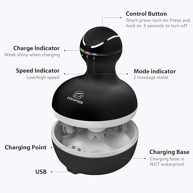 - Relaxing Scalp Massage: Comfier electric scalp massager is equipped with four massage heads with 28 individual nodes each which rotates both in clockwise and anti-clockwise direction giving you a soothing massage to help stimulate hair growth, increase blood circulation to the scalp and relief stress.