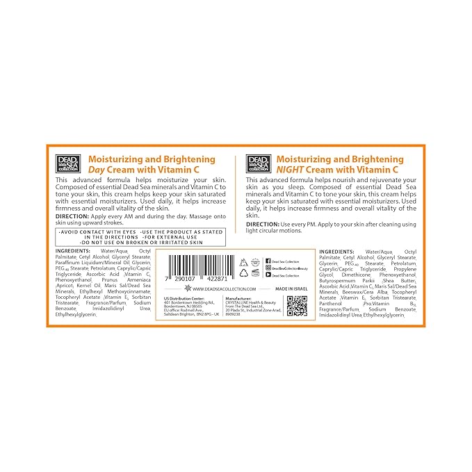 - Face cream with Vitamin C - our anti-wrinkle Day and Night Cream Kit with Vitamins A/E/C for women and men with pure Dead Sea minerals is specially formulated to deeply hydrate, rejuvenate and restore your skin. Our firming face cream locks in moisture, reducing the appearance of wrinkles and crease lines. The Collagen will leave your face looking smoother, fresher, and more supple!