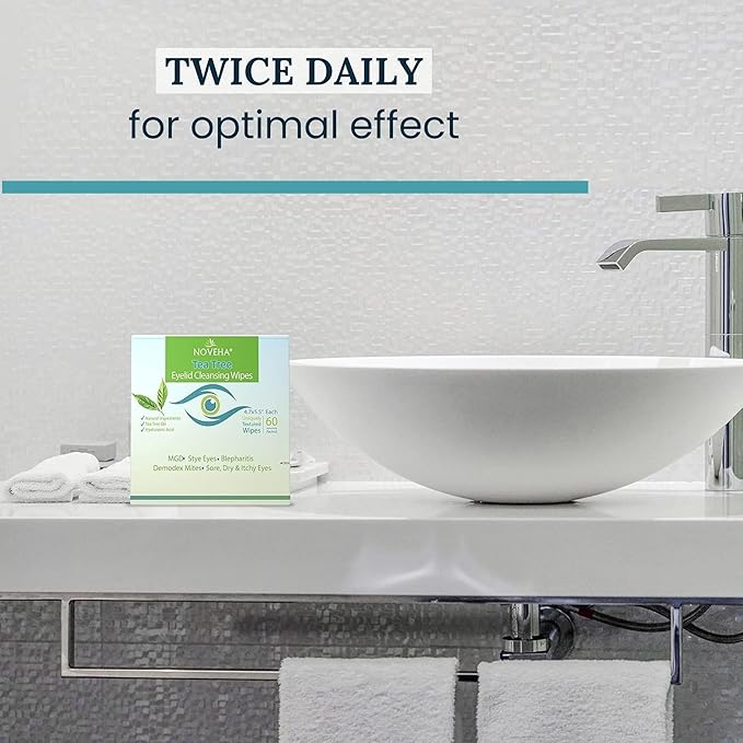 NOVEHA Tea Tree Oil Eyelid & Lash Wipes With Hyaluronic Acid, Green Tea & Chamomile For Blepharitis & Itchy Eyes, Individually Wrapped Eyelash Wipes Natural Makeup Remover & Daily Cleanser (Pack of 3)