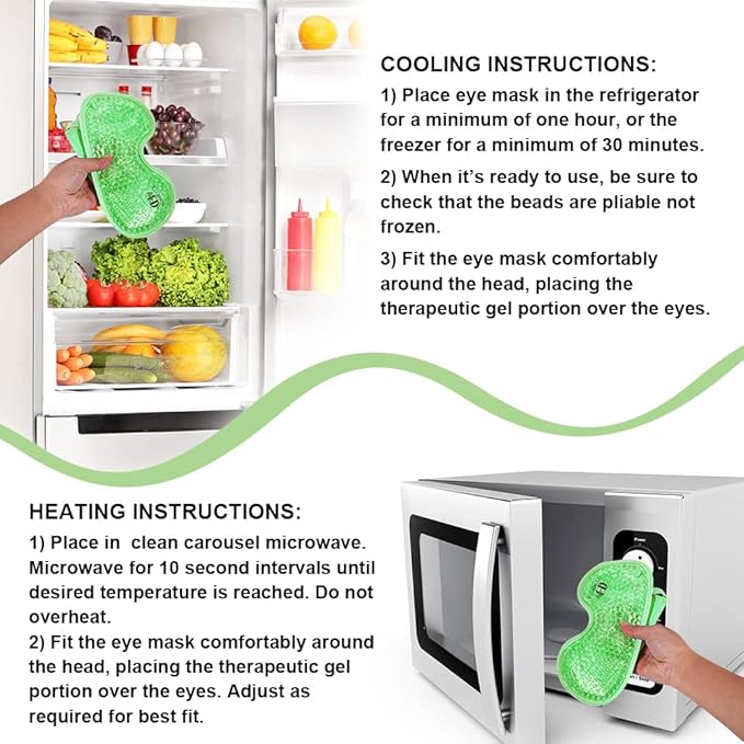 - ✿Hot Cold Therapy - For Cool Compress - Sealed the Gel eye mask in a storage bag and then place it in fridge for ice pack. Freeze it for 35 minutes or chill it for 1-2 hours. Cold eye mask can hold the therapeutic temperature for the doctor recommended time of approximately 20 minutes. For Warm Compress - Place it in microwave and heat it on Medium-high for 10 seconds at a time.