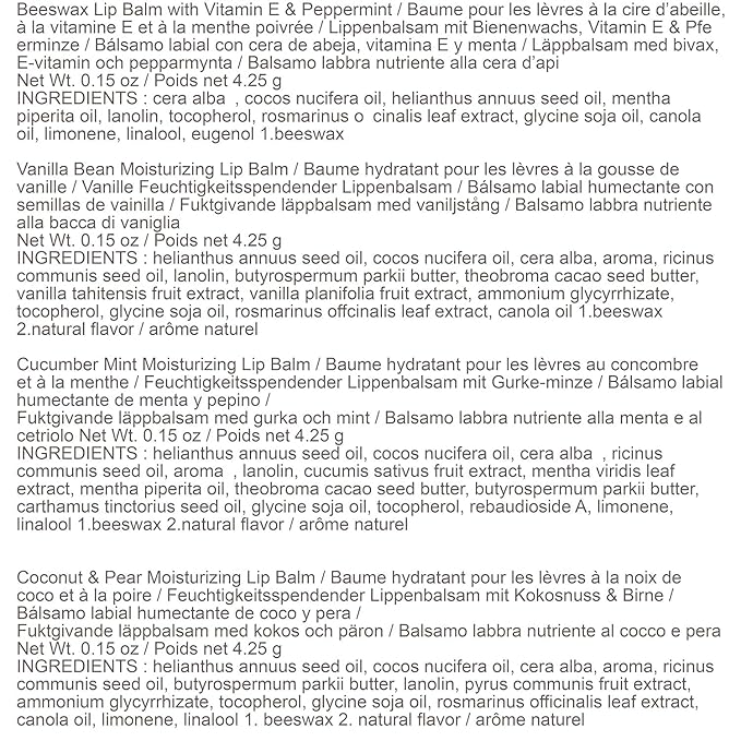 - BELOVED HOLIDAY FLAVORS: Start up your holiday spirit by enjoying the classic flavoring of the holidays with lip balms that taste like Classic, Vanilla Bean, Cucumber Mint and Coconut and Pear flavors