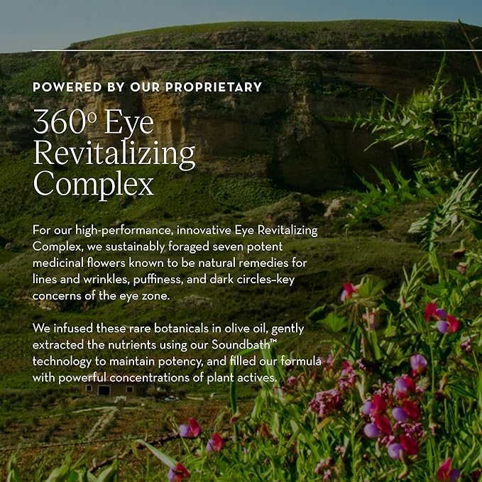 - 360Âş Eye Revitalizing Complex: A proprietary blend of 14 wild-foraged plants, including artichoke and dandelion, to lift, awaken, and revitalize the extended eye area.
