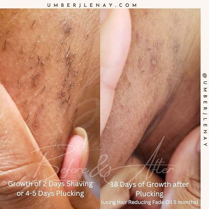- Versatile Benefits: Beyond hair reduction, our Hair Reducing Spot Fade Oil also targets hyperpigmentation, scarring, and ingrown hairs. Daily use improves hair reduction, delays regrowth, and shrinks hair follicles. Results may vary, but changes can be observed within 2 weeks to 2 months.