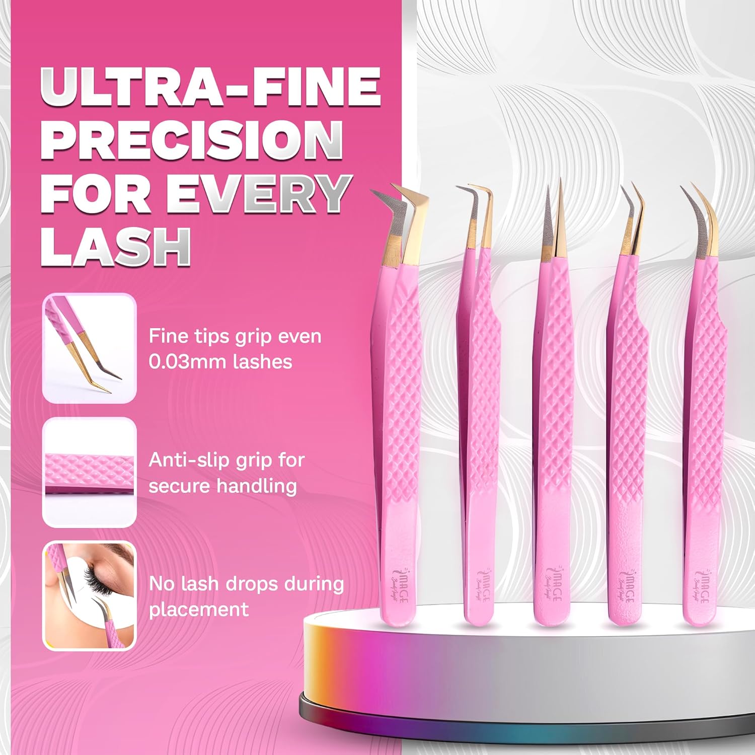 5 Pcs Fiber-Tip Japanese Steel Lash Tweezer Set with Leather Case, Professional Eyelash Tweezers for Lash Extensions – Titanium Coated, 90 & 45 Angled, Precision Pointed Tweezers (PINK)