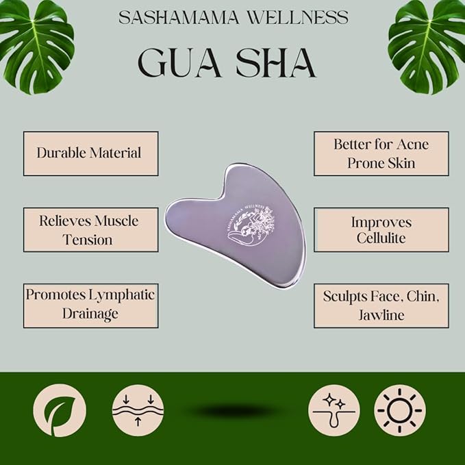 - Stainless Steel Gua Sha- sculpt your chin, jawline, legs, and forehead naturally during your pregnancy. Unbreakable and perfect for acne prone skin, helping with lymphatic drainage.