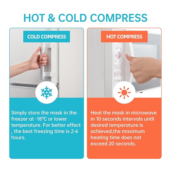 - Cold & Hot Compress: Gel face mask cold pack fills with medical grade gel beads with good temperature storage, it can be used as a hot or cold compress. For better results, when used cold, the best freezing time in the refrigerator is 2-6 hours. Or heat in microwave oven for 10 seconds to achieve the heat therapy effect.