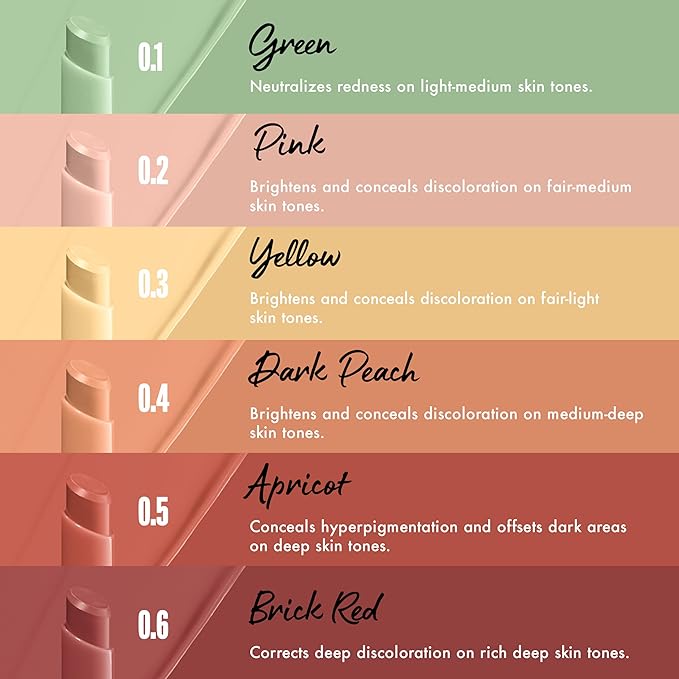 - Color Correcting Made Easy: Our 6 color correcting concealer shades for all skin tones and 18 complexion concealer stick shades help conceal & brighten like a pro. Fix dullness, redness, blemishes, dark spots, undereye circles, and discoloration