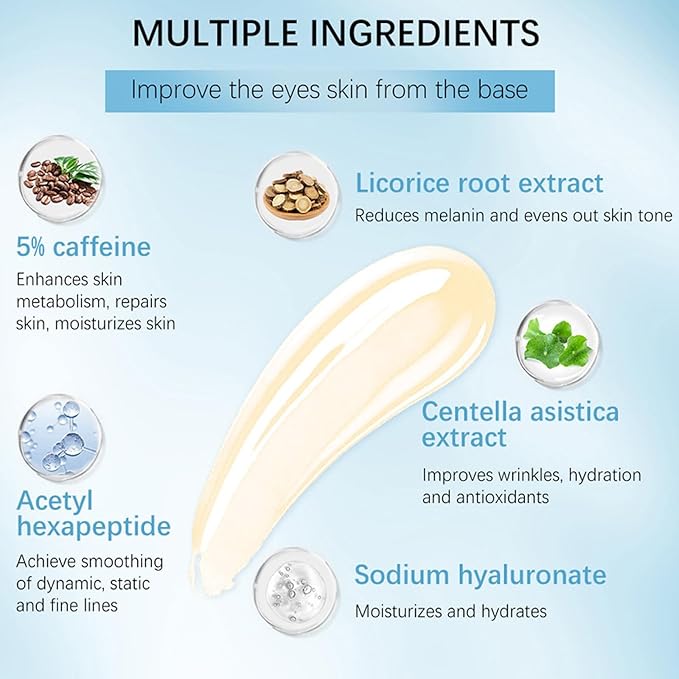 - Moisturizing Eye Cream:Our caffeine eye cream is formula with multiple moisturizing ingredient,like Centella asistica extract,Sodium hyaluronate,Acetyl hexapeptide ,the ingredient is excellent in moisturizing ,hydrating skin and improving wrinkle and fine lines