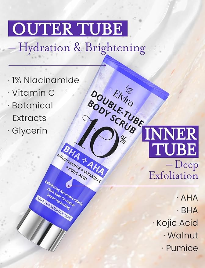 - INNOVATIVE DUAL-TUBE DESIGN: Like a facial for your body, our Dual Tube Body Scrub combines chemical and physical exfoliants with antioxidants. It refines dry, rough skin and bumps, giving you radiant results in one use