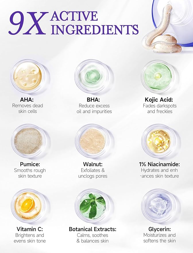- INNER TUBE - BODY SCRUBBER EXFOLIATOR: Features 10% Salicylic Acid, AHAs, Kojic Acid, Lactobionic Acid, and Lactic Acid to gently remove dead skin cells, clear oil, and smooth texture. Enhanced with Walnut Granules, Pumice Particles, and Natural Silica for deeper cleansing and softness