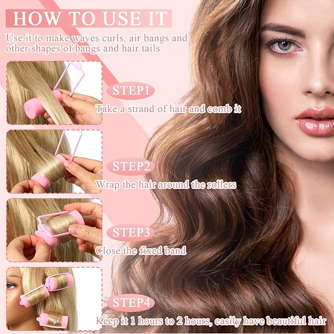- Note: this product is vacuum packed; It is recommended to leave it for 3 days before use to restore it to a round shape; And easy to use rollers grip the hair without the need for pins and clips; Just open the plastic fixed band wrap your hair on the roller, close the fixed band, go to sleep; Wake up you can get a beautiful curls