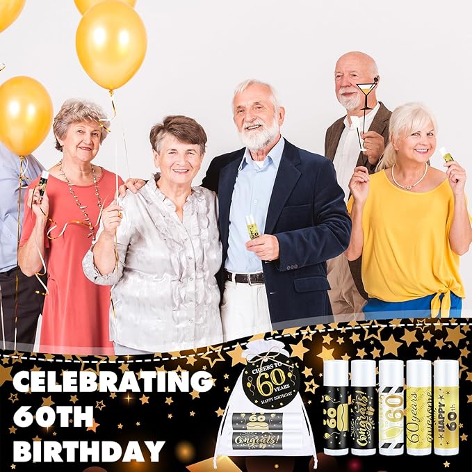 - 60Th Birthday Theme, Beauty Infused Within the Spirit: the 60th birthday theme of our 60th birthday accessories are practical and elegant; The theme resonates with the spirit of 60th birthday and joy, a spirit that is mirrored in our fun filled, vivacious balms; Draw strength, positivity, and vivacity from our 60th birthday themed balms, beauty with an added spirit