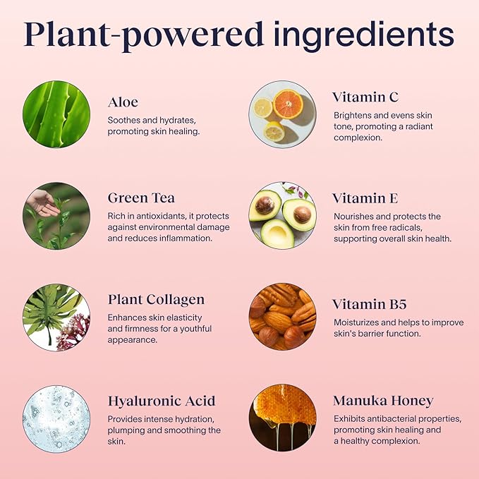 - MADE IN THE USA - Our unique formula is packed with powerful natural and organic anti-aging ingredients like Collagen, Green Tea, Manuka Honey, Aloe, Hyaluronic acid, CoQ10, Rose Hip Seed Oil, Jojoba Oil, Hibiscus, Shea Butter and more.