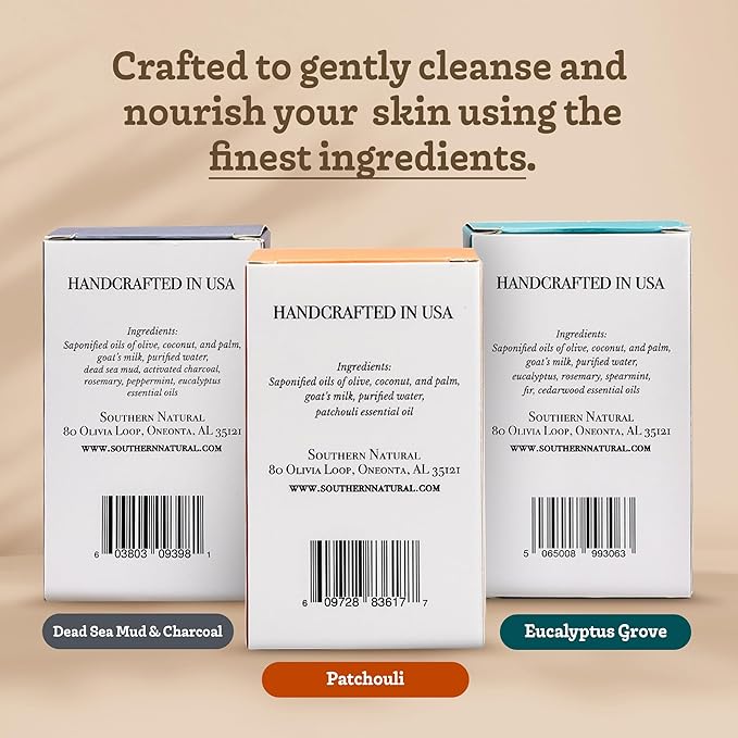 Southern Natural Goat Milk Soap Bar (Variety 3 Pack) Dead Sea Mud & Charcoal, Patchouli, Eucalyptus Grove - For Dry Sensitive Skin. Great For Face and Body.(Each Bar 4-4.5 oz)
