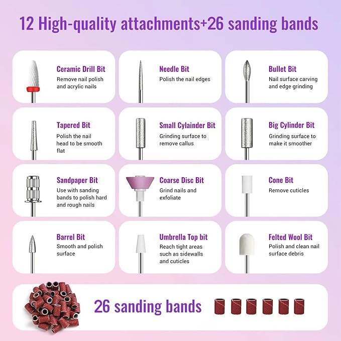 - 1.Professional Nail Drill Kit:Equipped with 12 drill bits and 31 sanding bands,it can be used for grinding, carving,cutting,polishing,and removing acrylic powder,polygel nails,nail polish gel,cuticle.It is professional for nail decoration and nail arts.
