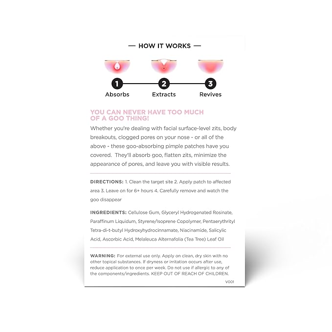 - VERSATILE ACNE SOLUTION: Whether you're battling facial zits, body breakouts, or clogged pores on your nose, our Goo Getter patches have you covered. Suitable for all skin types, these gentle yet effective patches make acne treatment easy, convenient, and dare we say... fun?