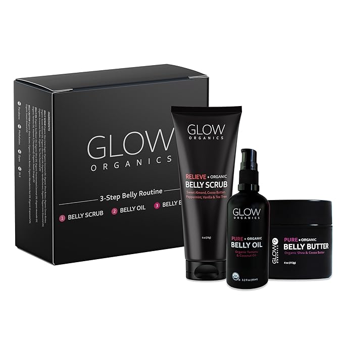 - ORGANIC PREGNANCY PRODUCTS: Glow Organics 3-Step Belly Routine Box includes the most popular Glow Organics products: Glow Organics Belly Scrub, Glow Organics Belly Butter and Glow Organics Belly Oil.