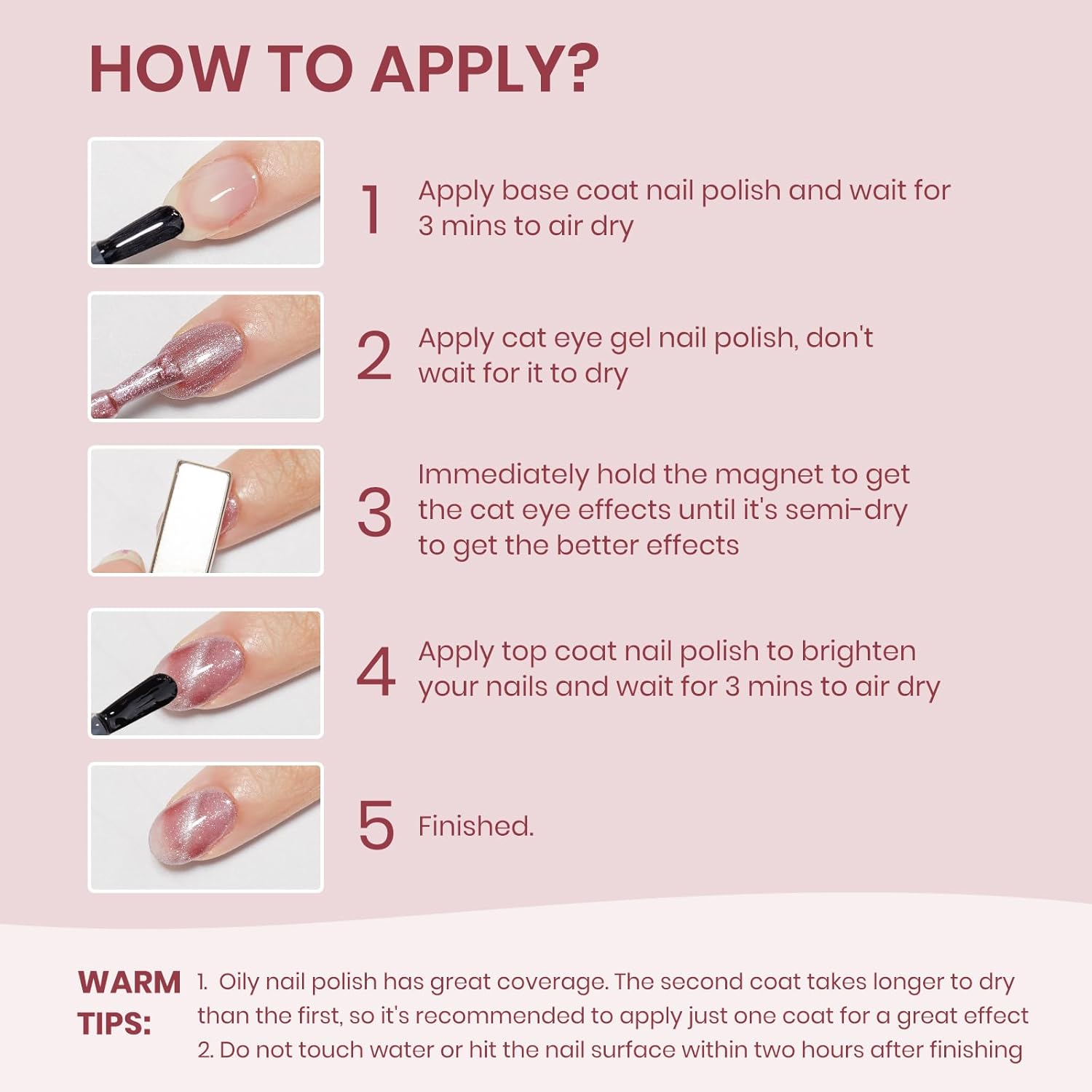 - Important Tips: 1. When the nail polish is not dry yet, it will be fluid. Use magnets to hold it in place until it's semi-dry, then take them off for a sharp cat-eye look 2. Do not touch water or hit the nail surface within two hours after finishing to avoid peeling; 3. Base and top coat nail polish art necessary