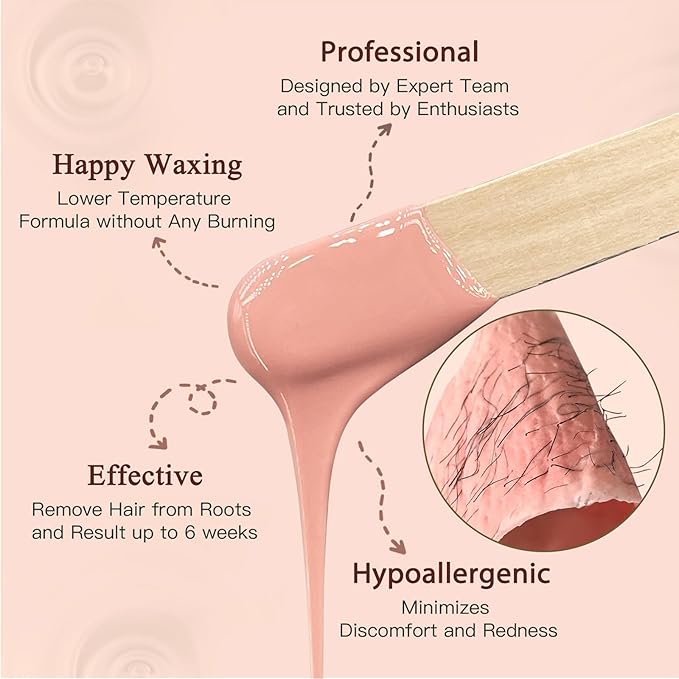 - Material Feature : Low-Melting & Even-Texture – Melts quickly and evenly for effortless spreading, allowing precise application and effective hair removal., Skin-Friendly & Hypoallergenic – Made with natural, ensuring a gentle hair removal process for all skin types, including sensitive skin., Works on All Skin & Hair Types – Effectively removes both fine and coarse hair, ensuring smooth results for all skin types, including sensitive skin. Low-Melting & Even-Texture – Melts quickly and evenly for effortless spreading, allowing precise application and effective hair removal., Skin-Friendly & Hypoallergenic – Made with natural, ensuring a gentle hair rem… See more