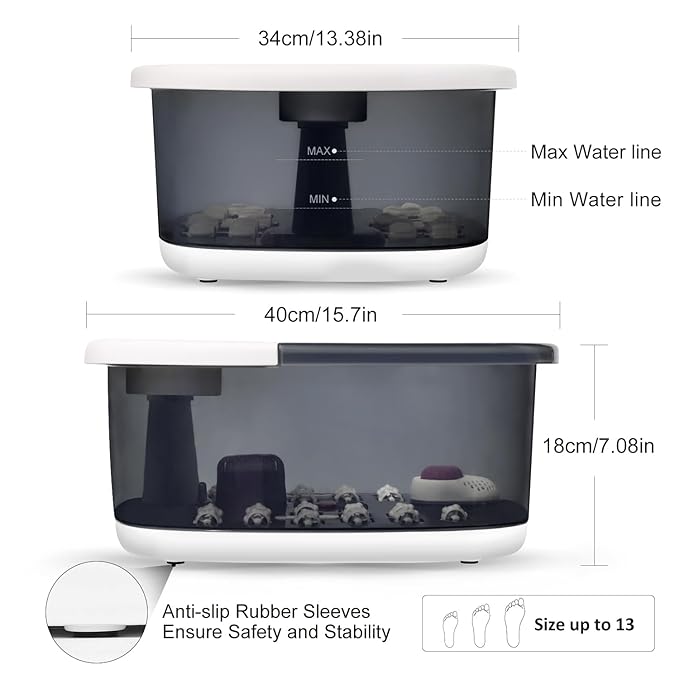 - 【Fast Heating & Intelligent Temperature Control】 MoodRelish Foot Spa Bath Massager with Heat Bubbles and Vibration Massage and Jets can heat up water efficiently and maintain water at selected temperature (95-118°F). Its 500W PTC Heater is with safe and secure multi-insulation protection and overheating protection, so you needn't worry about the safety. For Home Footbath, soaking feet in MoodRelish foot bucket can not only enhance the therapeutic effect, but also help relieve fatigue, swelling & redness.