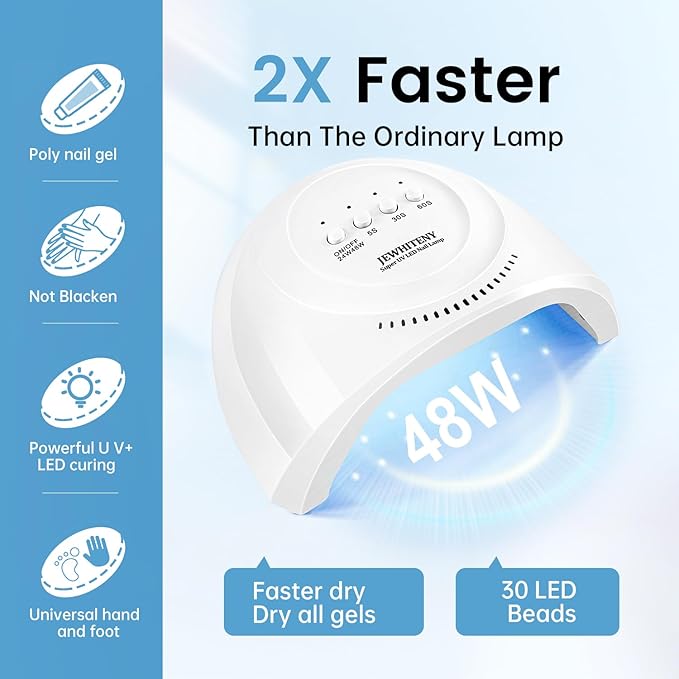 - [Mighty 48W UV/LED Lamp]: Equipped with premium LED beads. It cures all types of gels—poly gel, gel polish, base/top coats, and more—in record time, reducing drying time by over 50% for faster, salon-quality results.