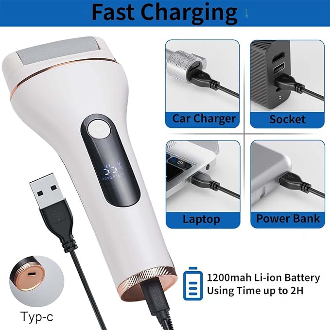- [LCD Power Display & Rechargeable Long Lasting]Our electric foot file features a 2000mAh lithium battery with overcharge protection and an LCD battery display, allowing you to monitor battery life easily. With 3 hours of USB-C charging, you'll get up to 240 minutes of minutes using.