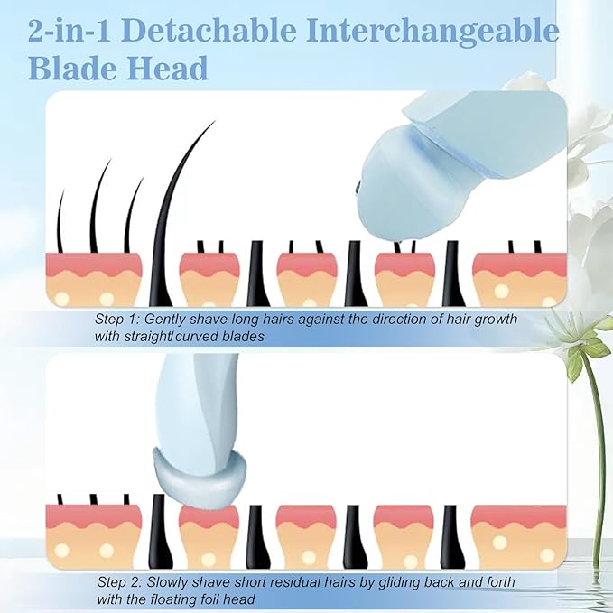 - đăDual Head Replaceable Electric RazorăThe glide pro 3.0 razor features a new design of 2-in-1 removable and replaceable heads. The dusk womens razor has two replacement heads, a 3-in-1 3D floating blade head and a round hypoallergenic facial trimmer head. Our bikini shaver is suitable for all body parts including sensitive areas such as the face, underarms, legs and bikini area. The bikini trimmer for women's curved blades are designed to hug the contours of your body, giving you salon-like, smooth, irritation-free hair removal