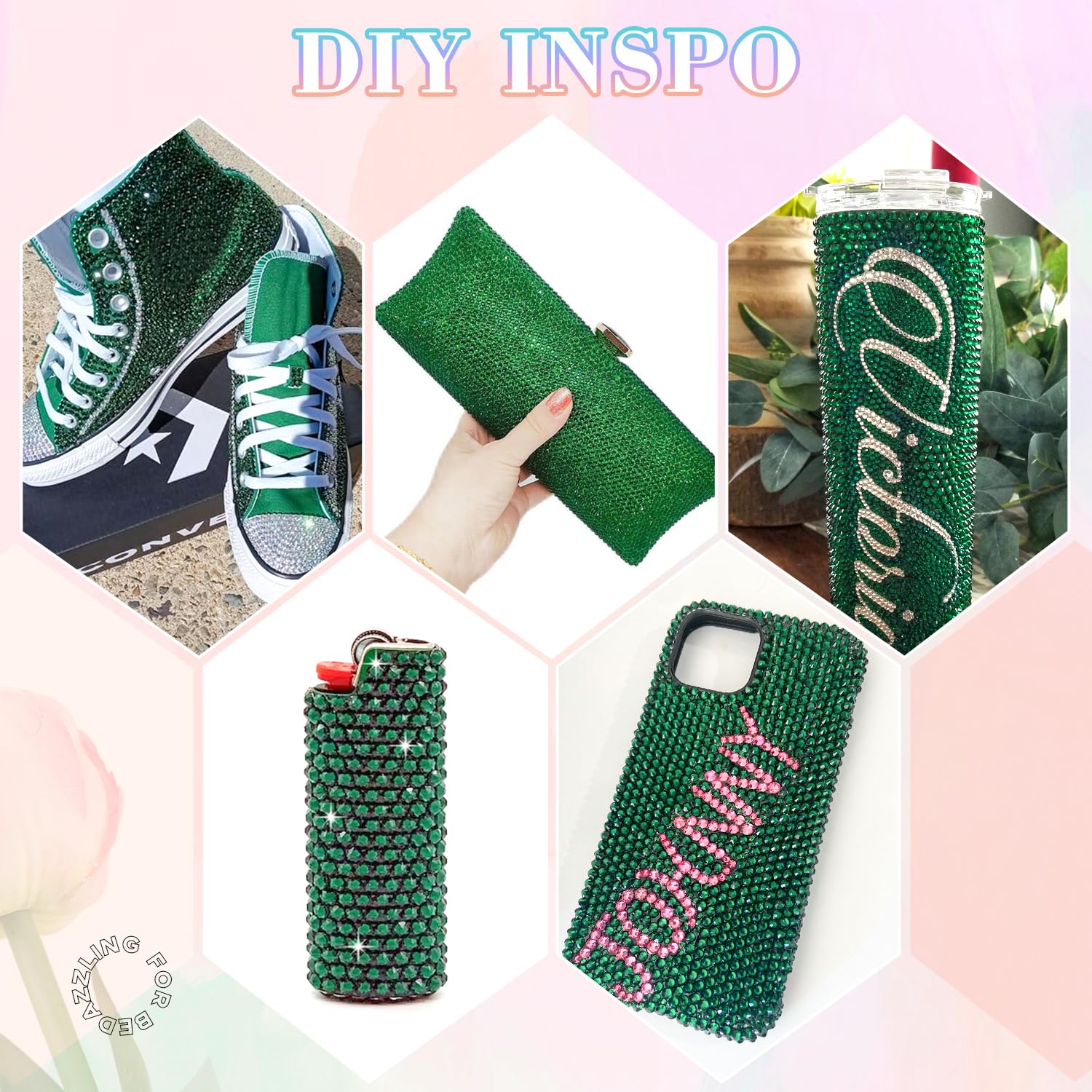 - PACKAGE CONTENT – This all-in-one bedazzler kit includes everything you need to start creating dazzling designs: 1 box of Emerald Green rhinestones with 24 grids (approx. 30,000 pcs of bedazzling rhinestones assorted size SS6/10/16/20/30 ), 1 precision tweezers, 1 pickup pen for handling small gems, and 3 tubes of B7000 jewelry glue for secure application.